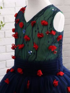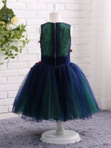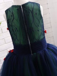 Best Knee Length Navy Blue Child Pageant Dress Tulle Sleeveless Lace and Appliques