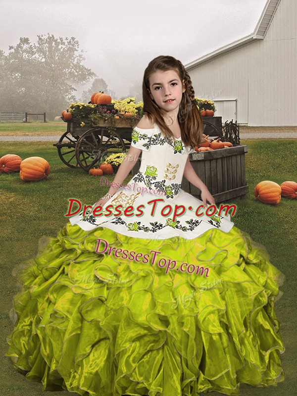 Best Olive Green Lace Up Straps Embroidery and Ruffles Pageant Dress Wholesale Organza Sleeveless