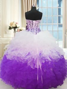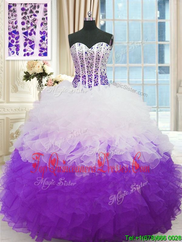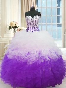 Best Organza Sweetheart Sleeveless Lace Up Beading and Ruffles Quinceanera Dress in White And Purple