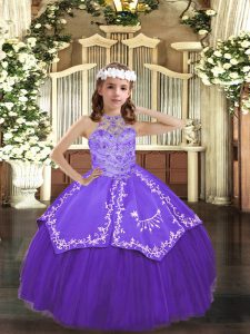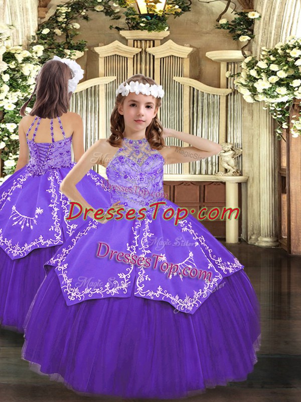 Best Purple Lace Up Halter Top Beading and Embroidery Little Girls Pageant Dress Tulle Sleeveless