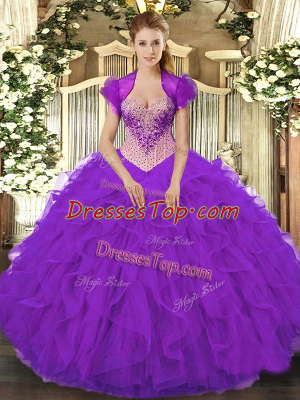 Best Purple V-neck Lace Up Beading and Ruffles Quince Ball Gowns Sleeveless