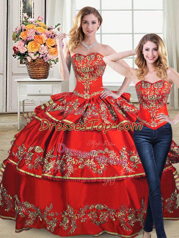 Best Red Lace Up Sweetheart Embroidery and Ruffled Layers Quinceanera Gown Satin and Organza Sleeveless