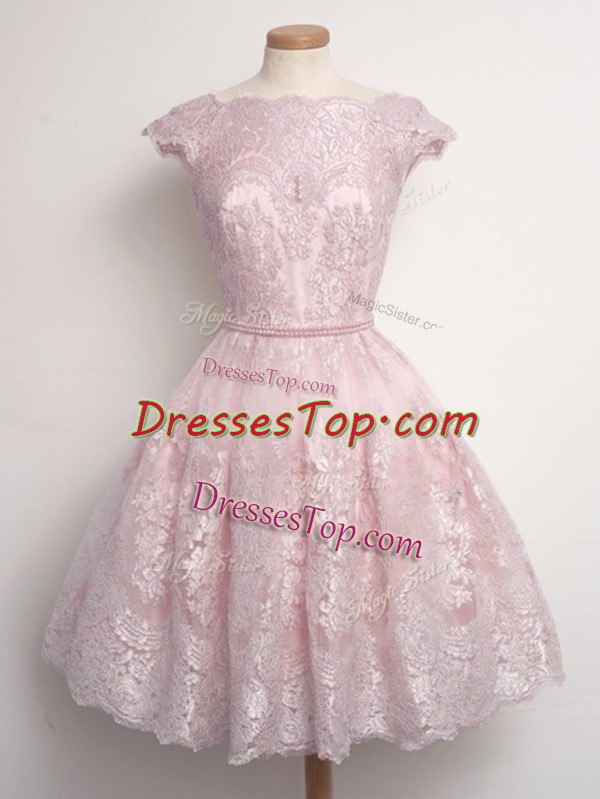 Best Selling A-line Damas Dress Baby Pink Scalloped Lace Cap Sleeves Knee Length Lace Up