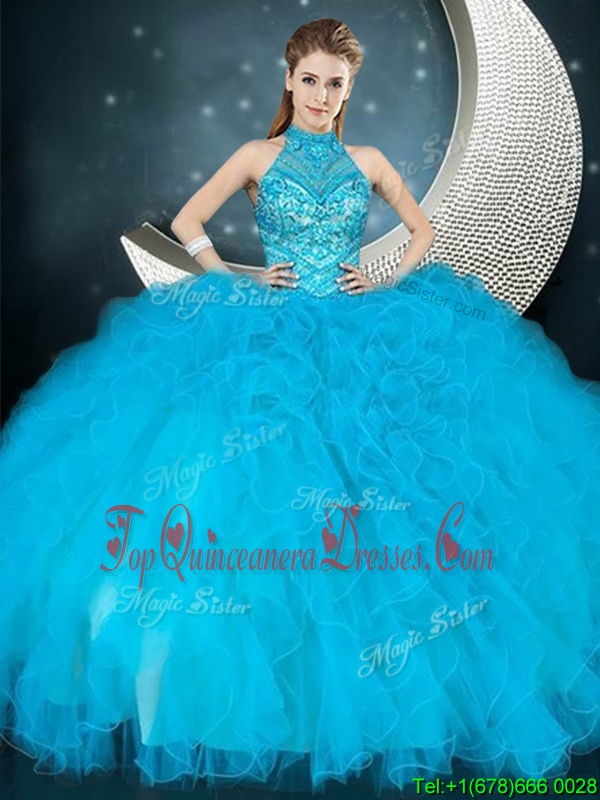 Best Selling Baby Blue Ball Gowns Halter Top Sleeveless Tulle Floor Length Lace Up Beading and Ruffles Quinceanera Dress