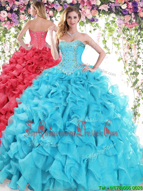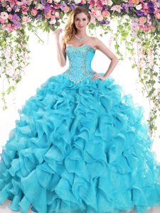 Best Selling Baby Blue Ball Gowns Organza Sweetheart Sleeveless Beading and Ruffles Lace Up Quinceanera Dress Sweep Train
