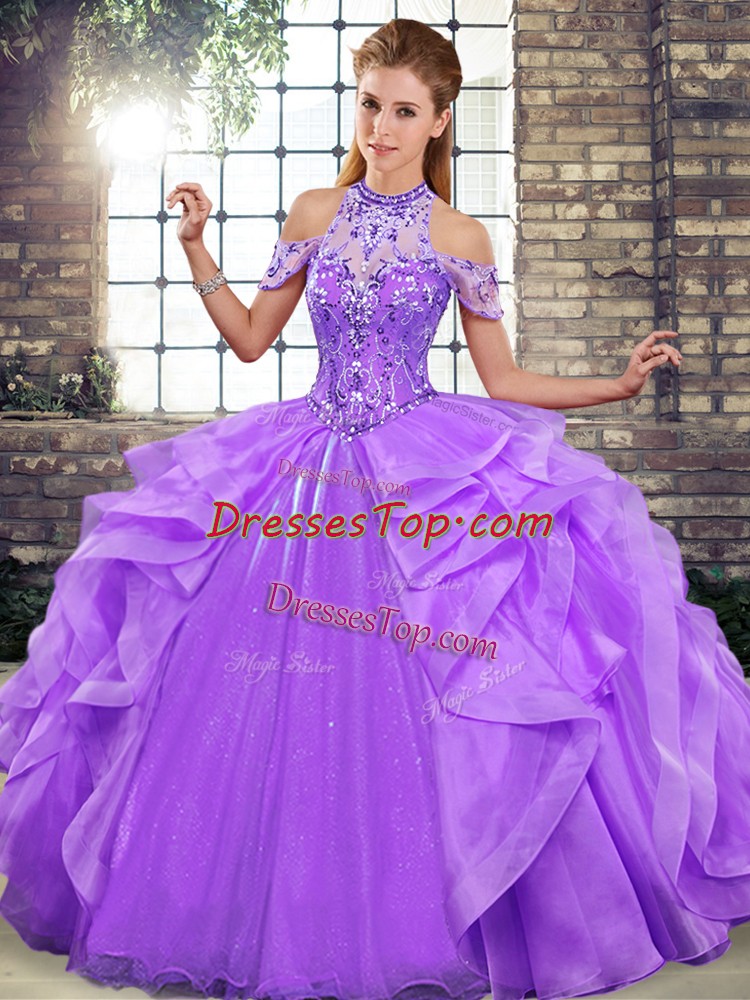 Best Selling Lavender Halter Top Neckline Beading and Ruffles Sweet 16 Quinceanera Dress Sleeveless Lace Up