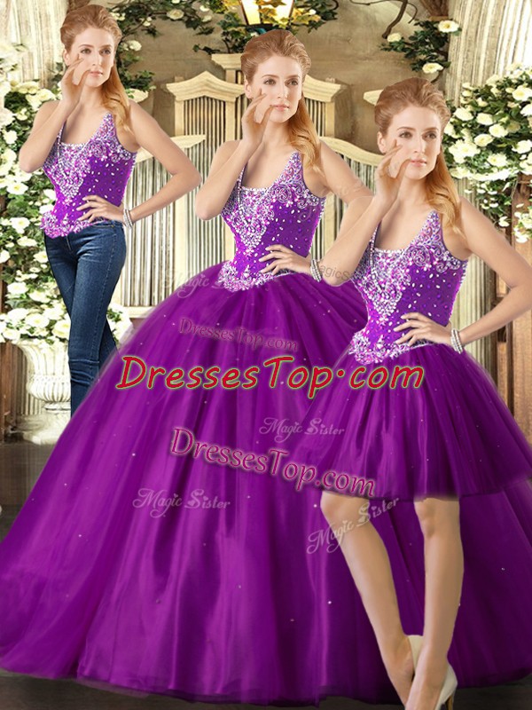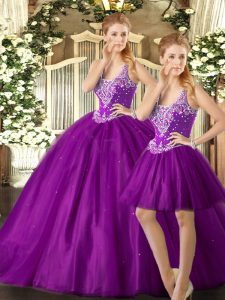 Best Selling Purple Straps Lace Up Beading Ball Gown Prom Dress Sleeveless