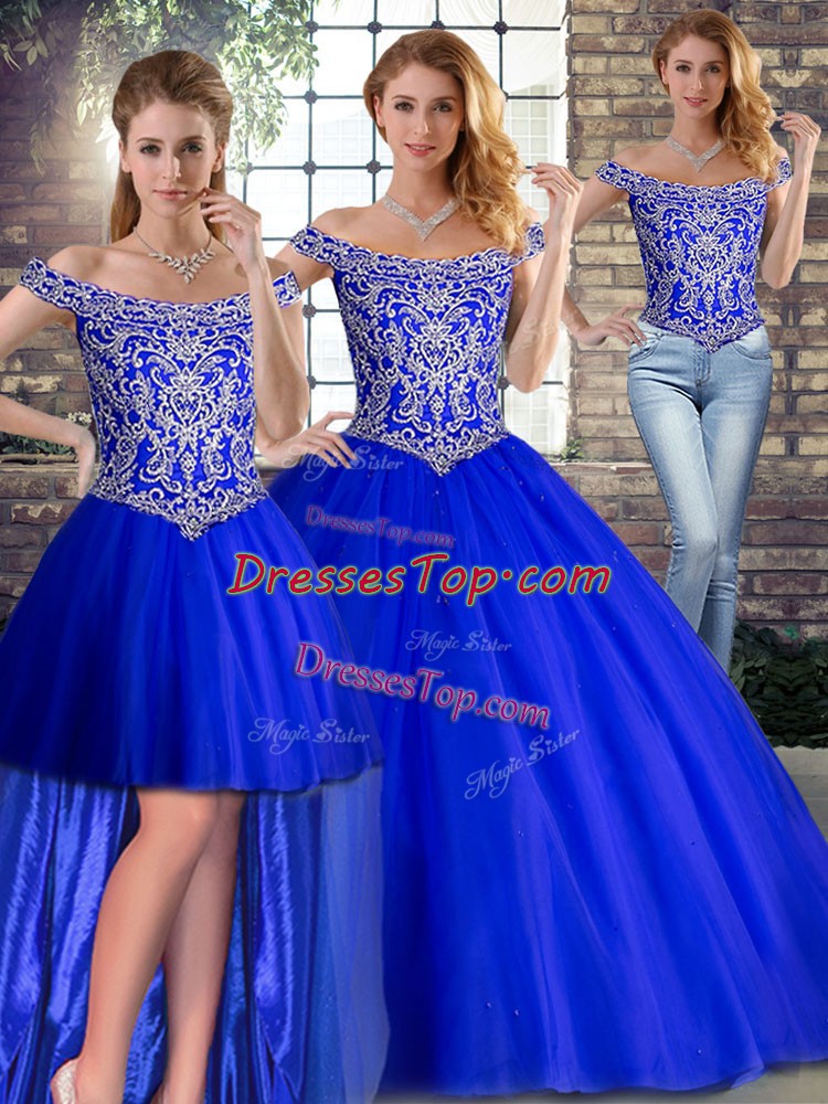 Best Selling Royal Blue Off The Shoulder Lace Up Beading Ball Gown Prom Dress Brush Train Sleeveless
