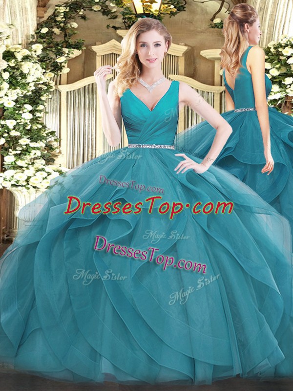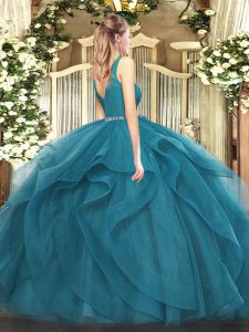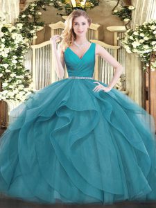 Best Selling Teal Zipper Quinceanera Gowns Beading and Ruffles Sleeveless Floor Length
