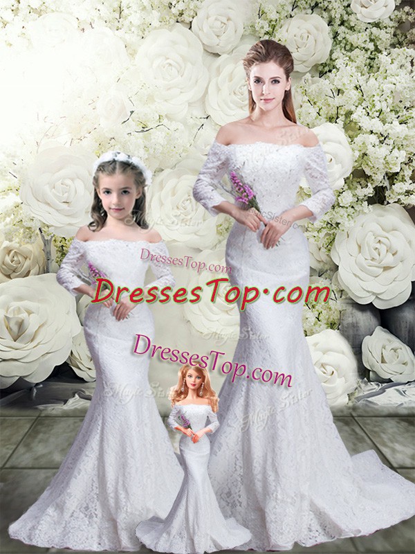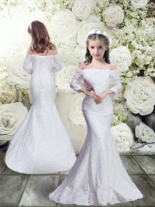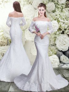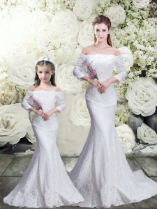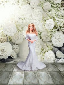 Best Selling White Mermaid Off The Shoulder 3 4 Length Sleeve Lace Brush Train Lace Up Lace Quinceanera Dress