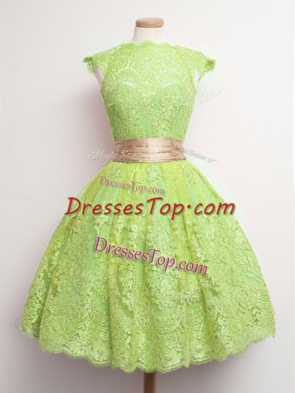 Best Selling Yellow Green Ball Gowns Lace High-neck Cap Sleeves Belt Knee Length Lace Up Vestidos de Damas