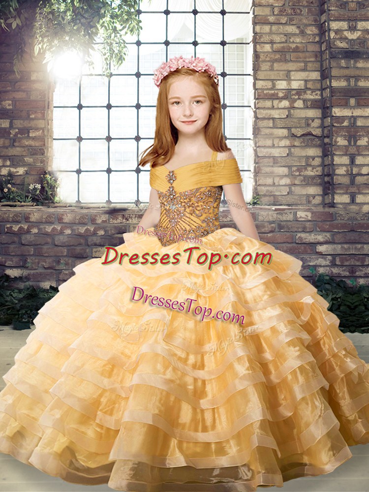 Best Sleeveless Brush Train Beading and Ruffled Layers Lace Up Little Girls Pageant Gowns