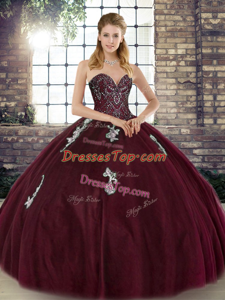 Best Sleeveless Floor Length Beading and Appliques Lace Up Quince Ball Gowns with Burgundy