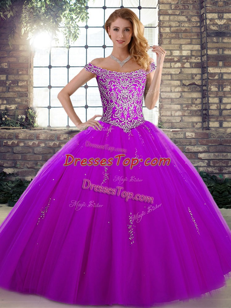 Best Sleeveless Tulle Floor Length Lace Up Vestidos de Quinceanera in Purple with Beading