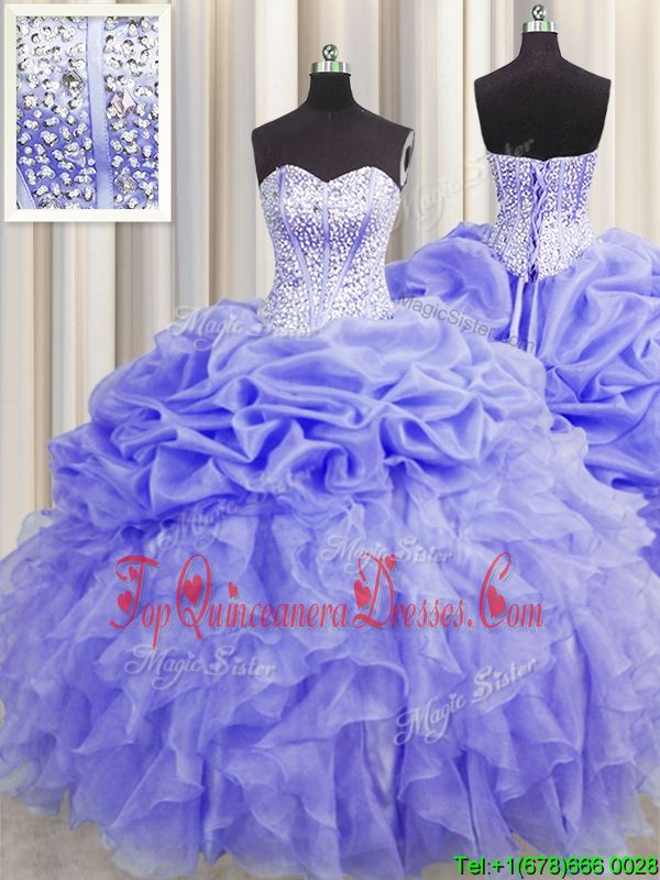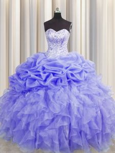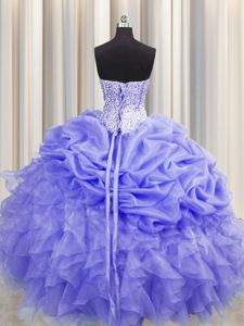 Best Visible Boning Lavender Lace Up Sweet 16 Dress Beading and Ruffles and Pick Ups Sleeveless Floor Length