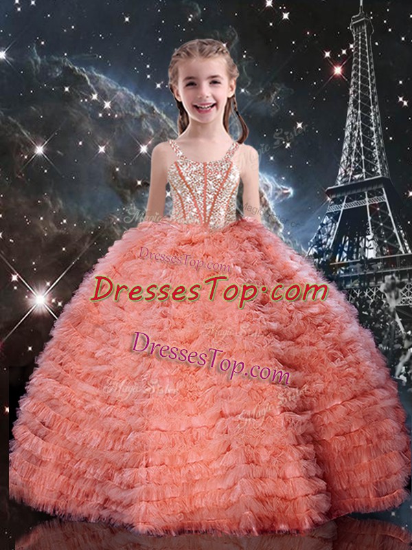 Best Watermelon Red Straps Lace Up Beading and Ruffled Layers Pageant Gowns For Girls Sleeveless