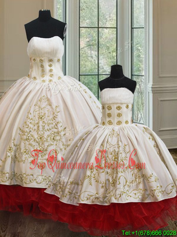Best White and Red Lace Up Ball Gown Prom Dress Embroidery and Ruffled Layers Sleeveless Floor Length