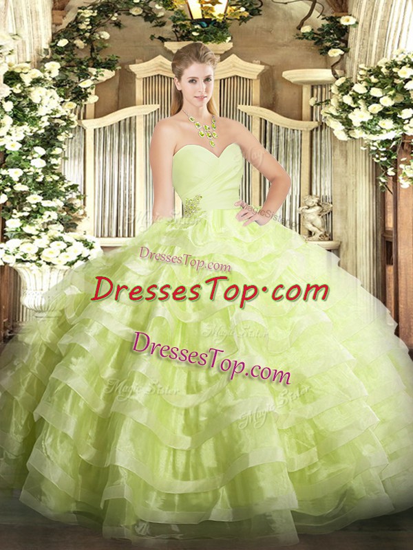 Best Yellow Green Ball Gowns Sweetheart Sleeveless Organza Floor Length Lace Up Beading and Ruffled Layers Quinceanera Gowns