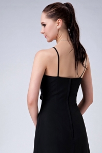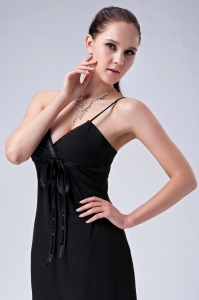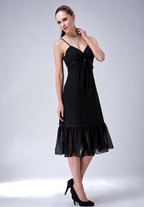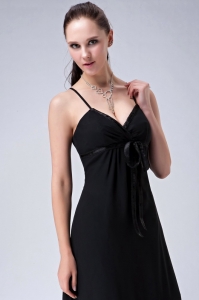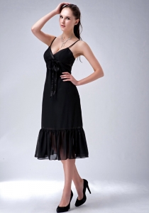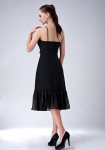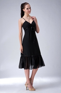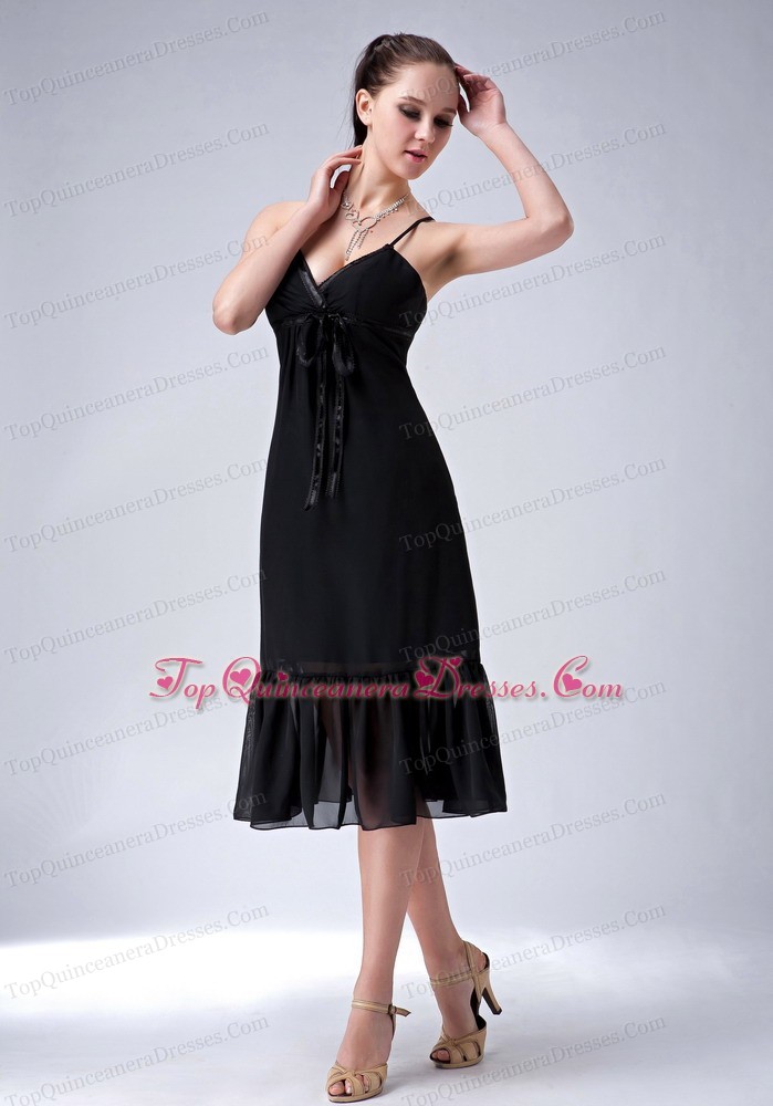 Black V-neck Spaghetti Straps Tea-length Chiffon Ruch Dama Dress