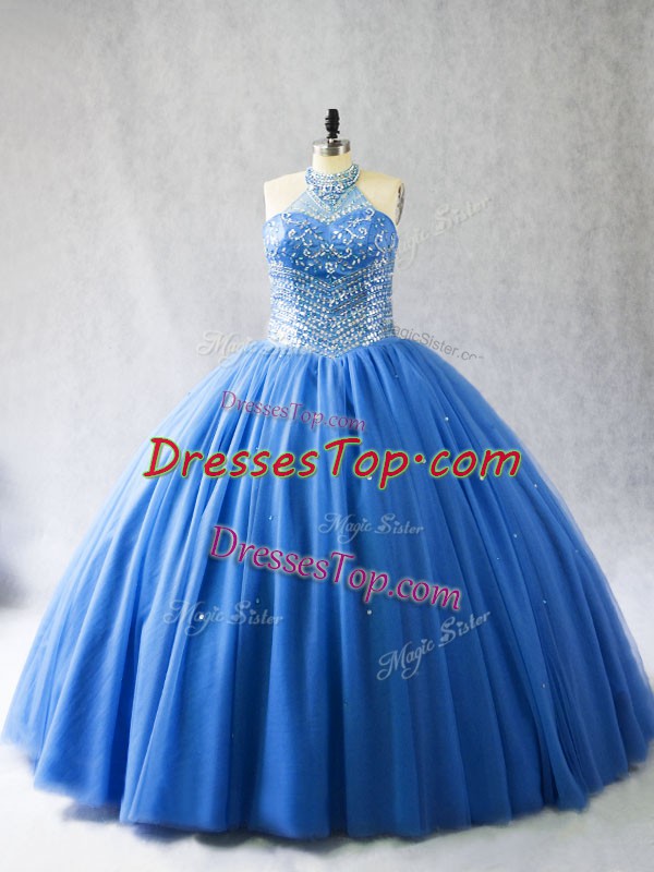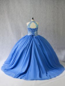 Blue 15 Quinceanera Dress Sweet 16 and Quinceanera with Beading Halter Top Sleeveless Brush Train Lace Up
