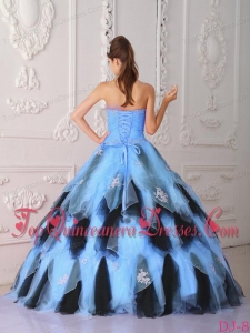 Blue and Black A-Line / Princess Strapless Floor-length Organza Appliques Vestidos de