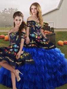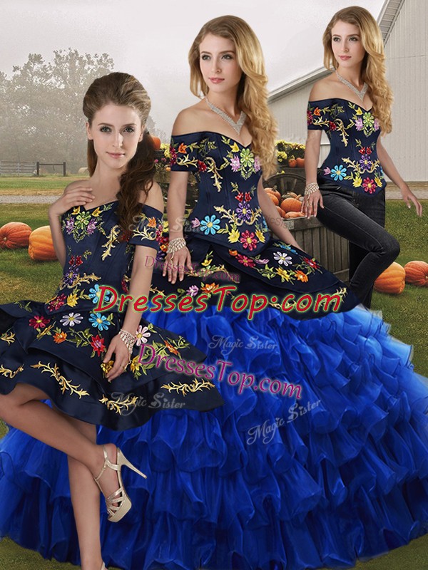 Blue And Black Off The Shoulder Lace Up Embroidery and Ruffled Layers Quinceanera Dress Sleeveless