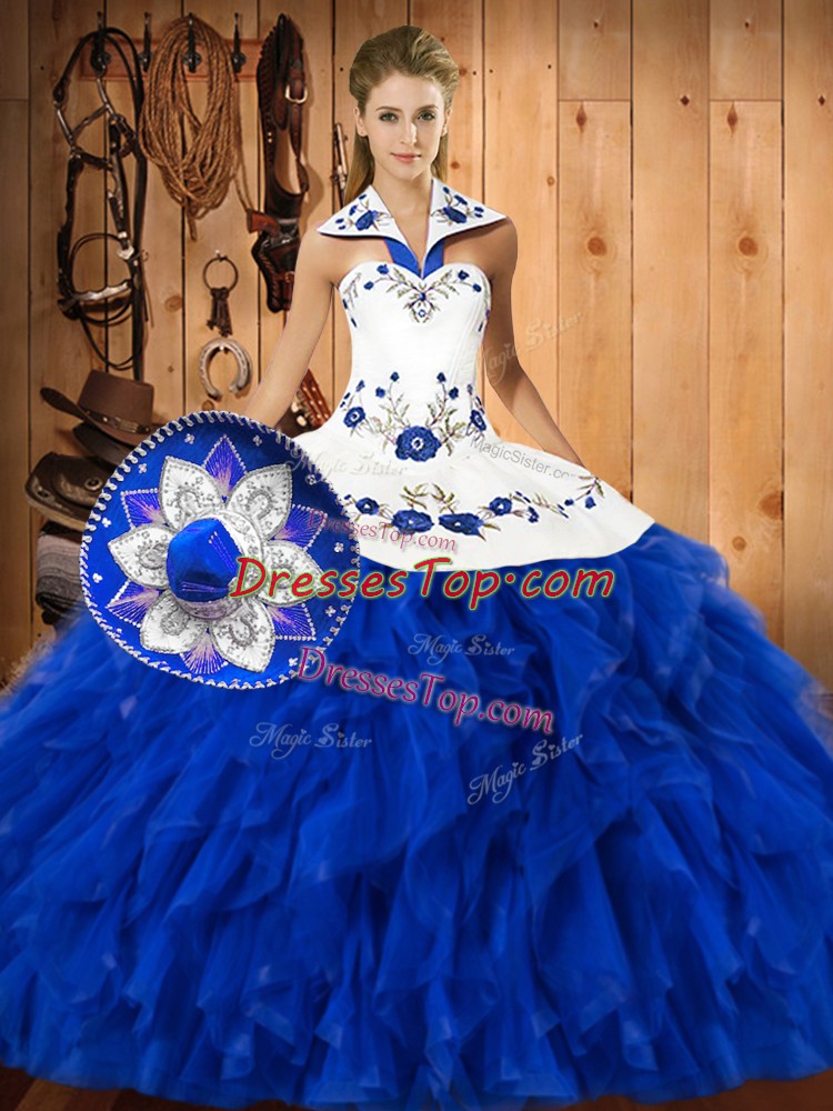 Blue And White 15th Birthday Dress Military Ball and Sweet 16 and Quinceanera with Embroidery and Ruffles Halter Top Sleeveless Lace Up