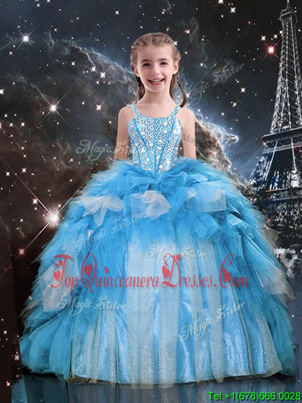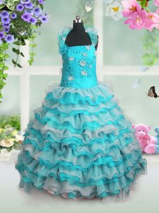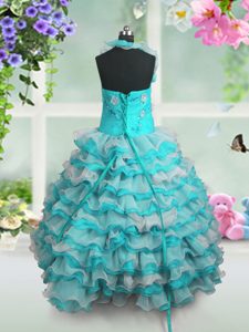 Blue And White Ball Gowns Organza Straps Sleeveless Beading and Appliques and Ruffled Layers Floor Length Lace Up Little Girl Pageant Dress