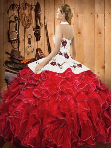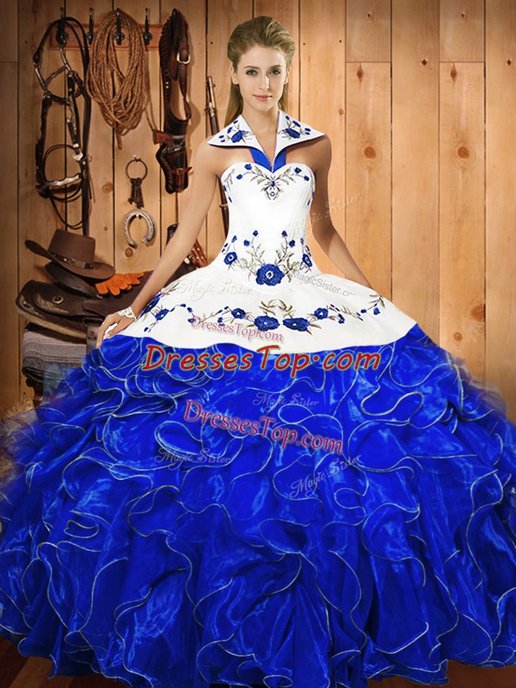 Blue And White Satin and Organza Lace Up Halter Top Sleeveless Floor Length Quinceanera Gowns Embroidery and Ruffles