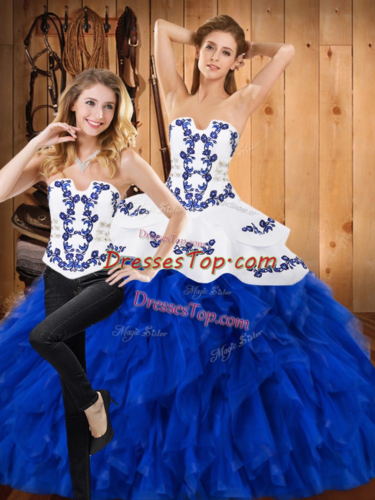 Blue And White Sleeveless Satin and Organza Lace Up Sweet 16 Dresses for Military Ball and Sweet 16 and Quinceanera