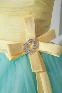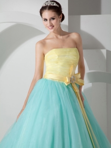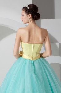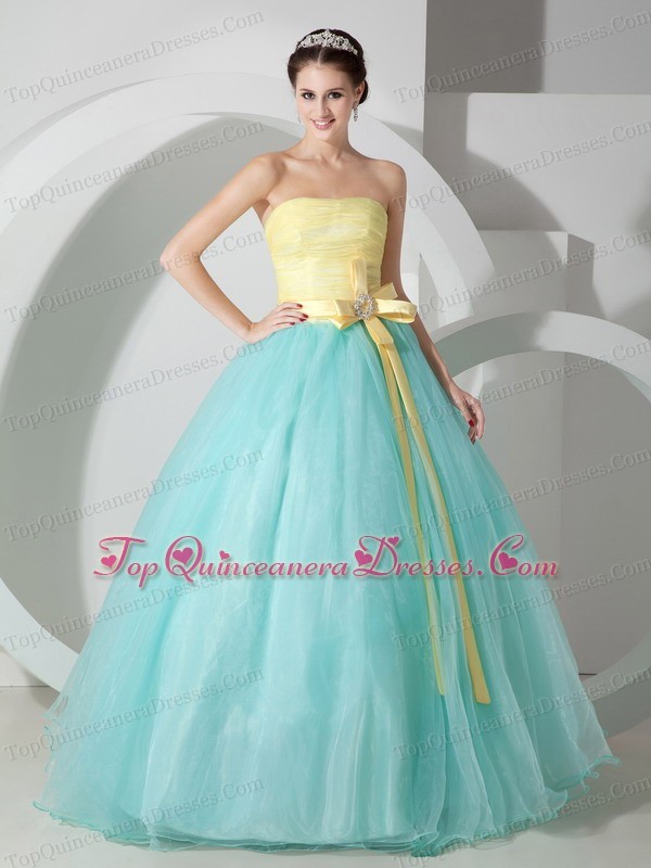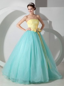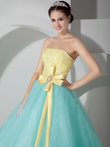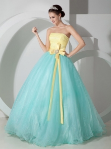 Blue and Yellow Strapless Quinceanea Dress With Sash