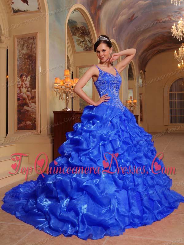Blue Ball Gown Spaghetti Straps Floor-length Organza Embroidery Quinceanera Dress