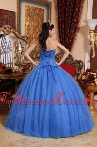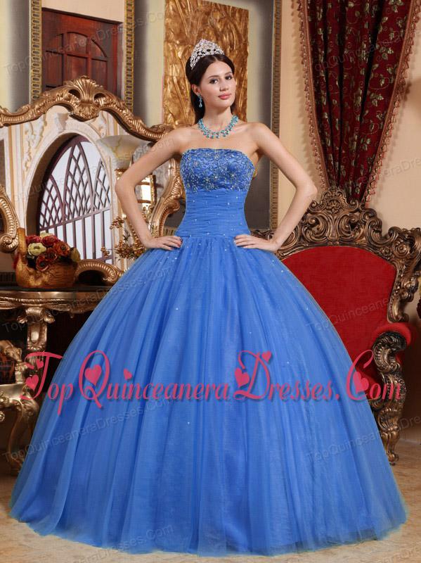 Blue Ball Gown Strapless Floor-length Tulle Embroidery with Beading Fashionable Quinceanera Dress