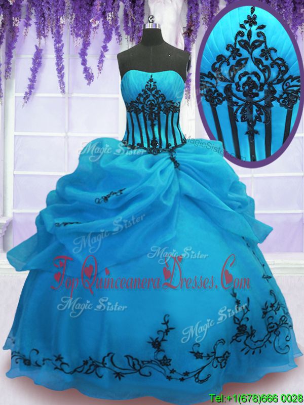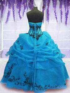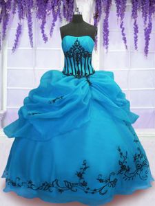 Blue Ball Gowns Embroidery Sweet 16 Dresses Lace Up Organza Sleeveless Floor Length