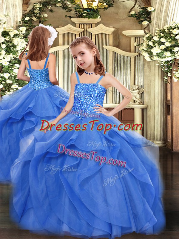 Blue Ball Gowns Organza Straps Sleeveless Beading and Ruffles Floor Length Lace Up Child Pageant Dress