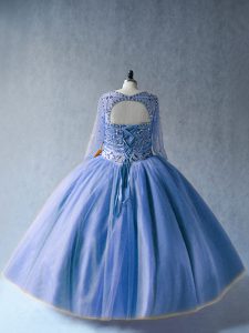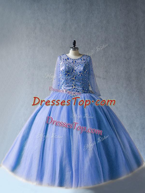 Blue Ball Gowns Scoop Long Sleeves Tulle Floor Length Lace Up Beading Vestidos de Quinceanera