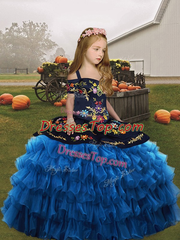 Blue Ball Gowns Straps Sleeveless Organza Floor Length Lace Up Embroidery and Ruffled Layers Kids Pageant Dress