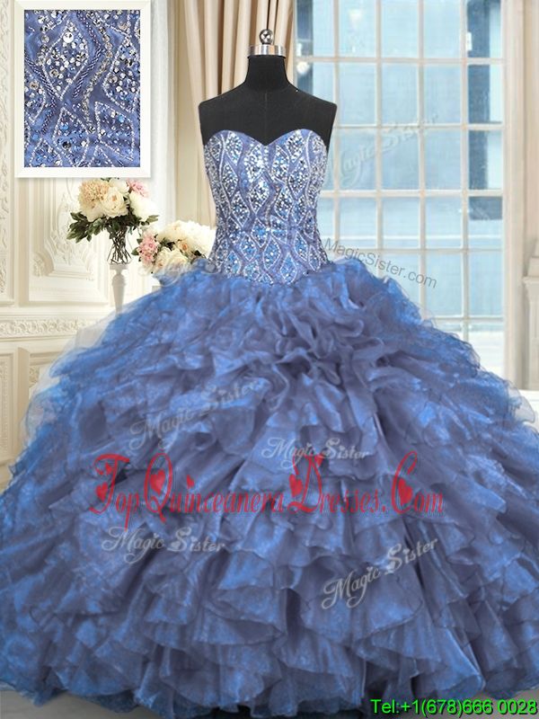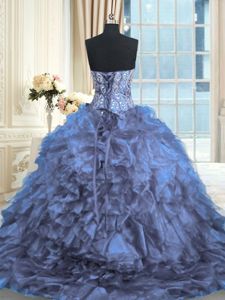 Blue Ball Gowns Sweetheart Sleeveless Organza Brush Train Lace Up Beading and Ruffles Sweet 16 Dresses