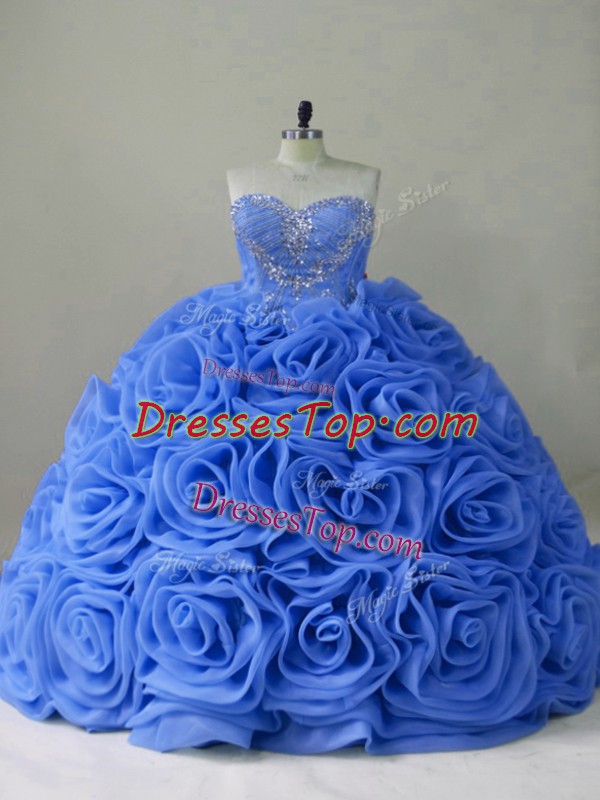 Blue Ball Gowns Sweetheart Sleeveless Organza Brush Train Lace Up Beading Quinceanera Dress