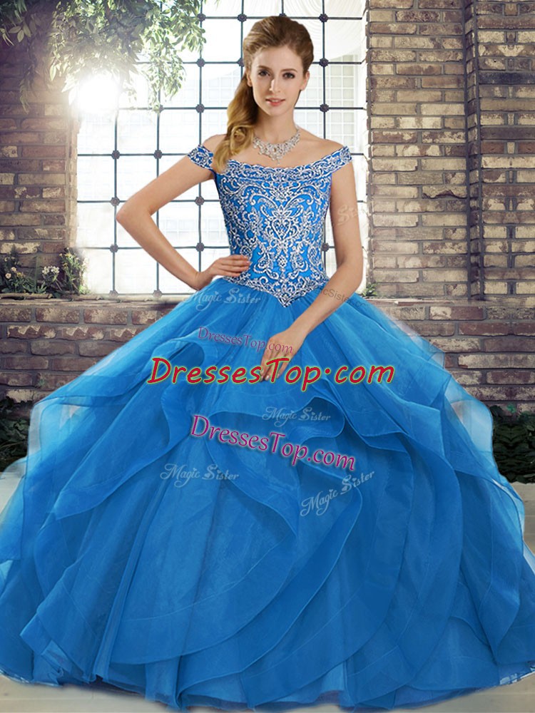 Blue Ball Gowns Tulle Off The Shoulder Sleeveless Beading and Ruffles Lace Up 15th Birthday Dress Brush Train