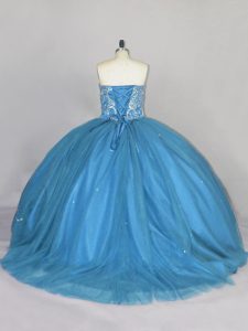 Blue Ball Gowns Tulle Sweetheart Sleeveless Beading Lace Up 15th Birthday Dress Brush Train