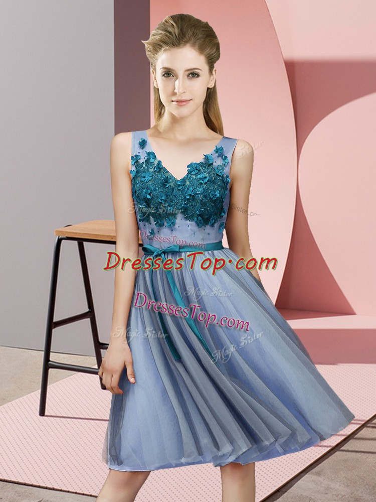 Blue Empire V-neck Sleeveless Tulle Knee Length Lace Up Appliques Vestidos de Damas