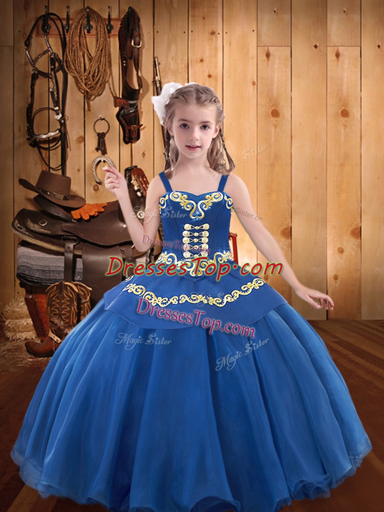 Blue Lace Up Child Pageant Dress Beading and Embroidery and Ruffles Sleeveless Floor Length