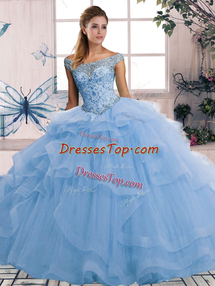 Blue Lace Up Off The Shoulder Beading and Ruffles Vestidos de Quinceanera Tulle Sleeveless
