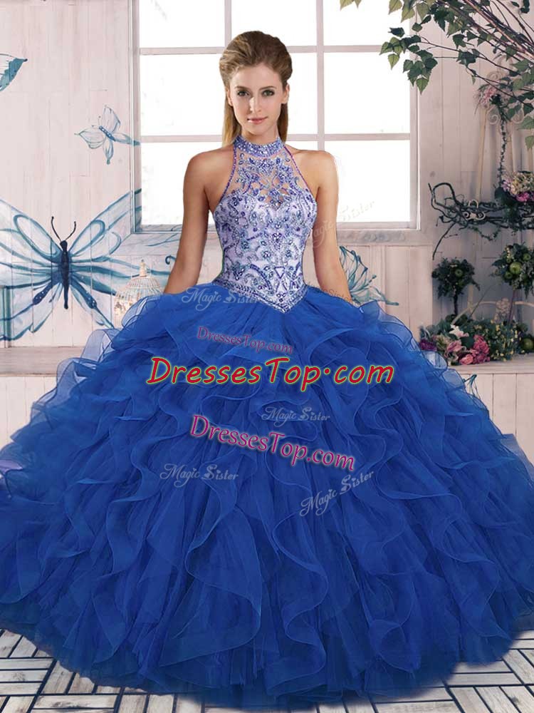Blue Lace Up Quinceanera Dresses Beading and Ruffles Sleeveless Floor Length