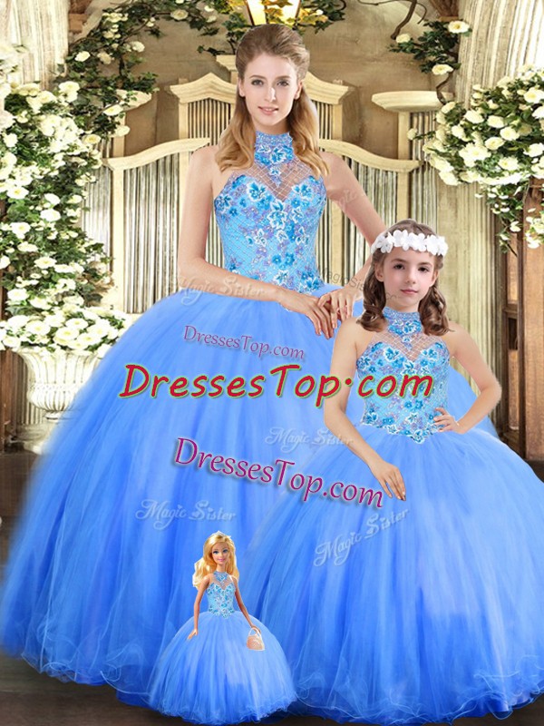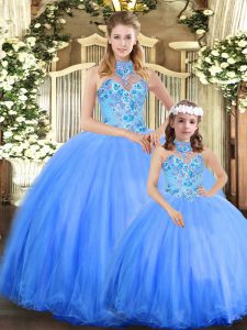 Blue Lace Up Quinceanera Dresses Embroidery Sleeveless Floor Length
