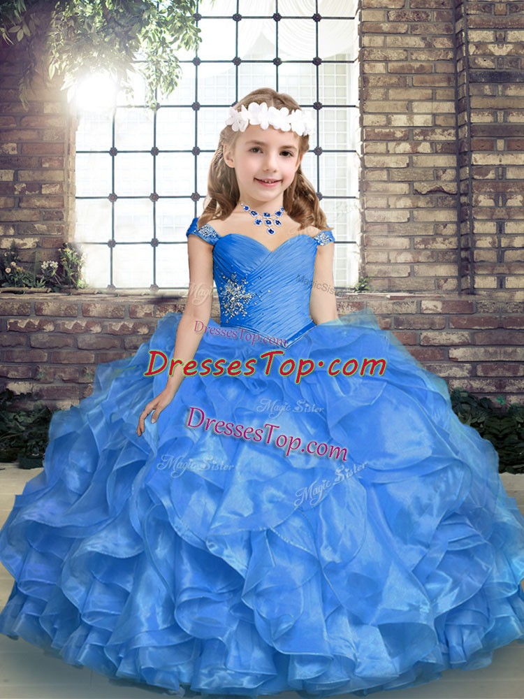 Blue Lace Up Straps Beading and Ruffles and Ruching Little Girls Pageant Gowns Organza Sleeveless