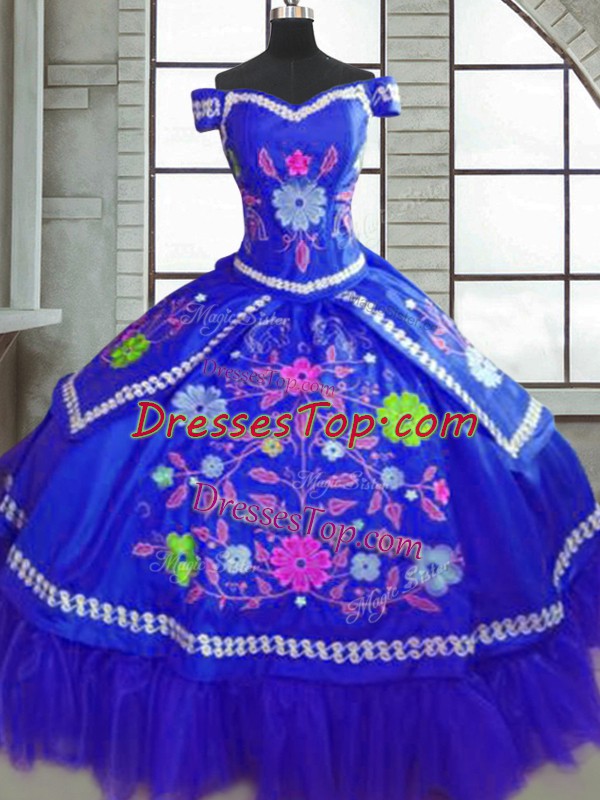 Blue Lace Up Sweet 16 Dress Beading and Embroidery Short Sleeves Floor Length