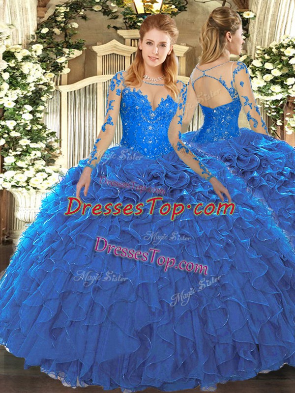 Blue Long Sleeves Lace and Ruffles Floor Length Quinceanera Dresses
