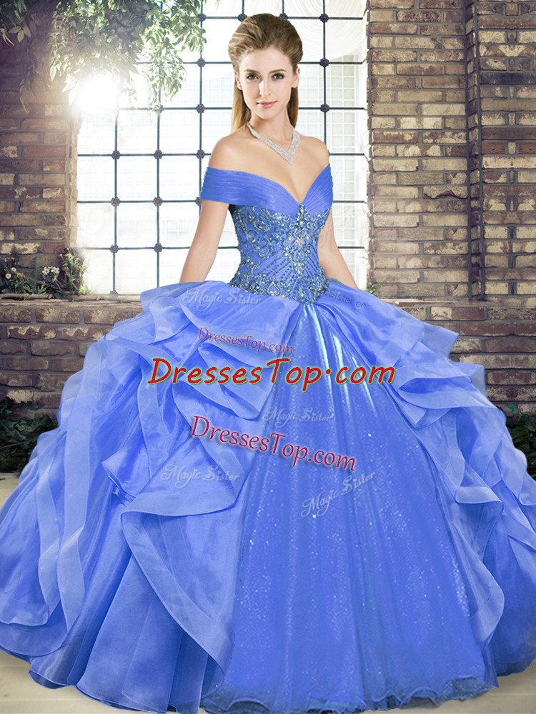 Blue Off The Shoulder Lace Up Beading and Ruffles Quinceanera Dress Sleeveless